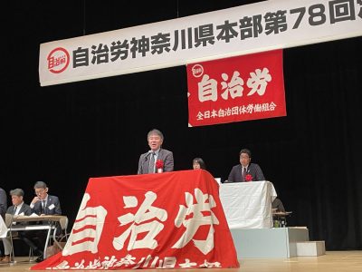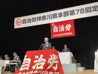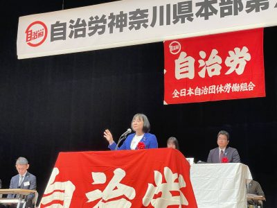 10月10日 10時より、ひらしん平塚文化芸術ホールにおいて、私の出身組織であります自治労神奈川県本部の定期大会が開催され、組織内議員の立場で出席し、自治体議員連合の副会長として挨拶をさせていただきました。今回の定期大会をもって、蓼沼委員長から、藤沢市職労出身の中野委員長に交代するとのことです。中野委員長のもと自治労神奈川県本部がより充実・発展することを祈念します。写真は挨拶をする、蓼沼県本部委員長、岸まきこ自治労組織内参議院議員と私。