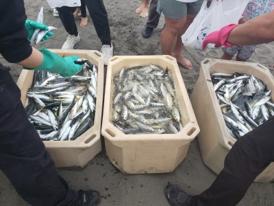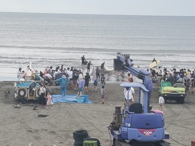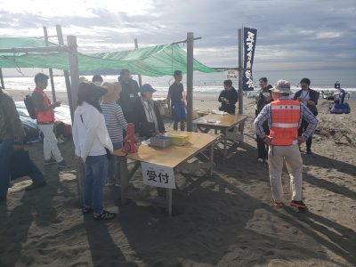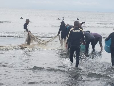 10月19日 鵠沼海岸の「堀川網」で、自治会(五友会)の地引網が開催され、役員(顧問)として従事しました。これまでは無料で開催していたのですが、参加者が自治会会員の一部になるため、今回から1世帯1,000円の負担をいただくことにしました。 今回の地引網は、網元も驚くぐらい大漁でしたが、小さなサバが9割、アジが1割で、ほとんどのサバは処分となりました。参加者は41世帯で、家族みんなで楽しく網を引いて、最期にたくさん魚を持って帰ってもらいました(^^♪