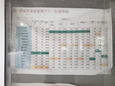 視察した高知県農業技術センターの近くに、津波避難タワーがありましたので見学しました。現地で貼りだされていた資料によると、南国市内には15カ所の津波避難タワーが設置されているとのことでした。今回見学した施設は、823人が収容できる施設で、津波到達時間は41分との想定でした。施設内には、トイレ、備蓄倉庫、更衣・授乳室、災害対策室の機能がありました。