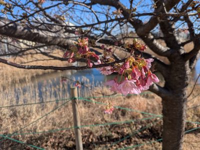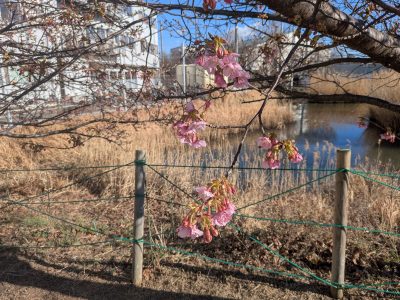 記録的な寒波と連日報道がされています。藤沢も風が冷たい日々が続いていますが、はす池横の公園にある早咲きの桜のつぼみが大分膨らんできました。その中でも何輪か咲き始めていました。