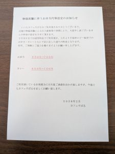 今日は議会本会議が午前中に終了しましたので、お昼は、本庁舎1階ロビーで販売しているお弁当(650円)を買って食べました。お弁当と一緒に価格改定の案内をいただきました。いろんなところで物価上昇を感じます。。