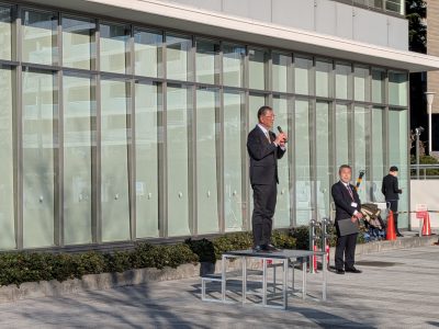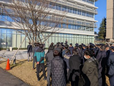 1月5日は、市役所の仕事始めです。例年の取組ですが、市役所近くの所で、朝7時30分から、市役所に出勤する職員の皆さんに、新年の挨拶をしました。その後、8時40分から、市長による事務始め式が、市役所サンライズ広場で行われましたので、私も職員と一緒に、鈴木市長の年頭の挨拶を聞きました。