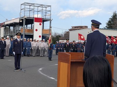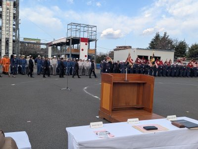 1月11日 9:30より、石川の消防防災訓練センターにおいて、藤沢市消防出初式が開催されました。家を出るときは、暖かい日だと思っていたのですが、風が強まり寒い中での出初式となりました。出初式は、消防に対する認識と信頼を深め、更に、消防団員等の士気の高揚を図ることを目的として行われました。