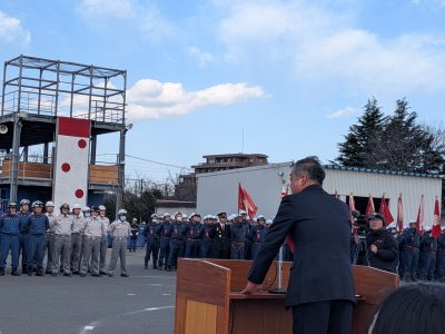 昨年は大船渡市で大規模林野火災がありました。今年は現在、山梨県上野原市で林野火災が発生しており、今なお鎮火や鎮圧の目途が立っていません。雨量が少なく乾燥が続く中で、強風の日が多く、ひとたび火災が発生すれば大規模な災害につながります。今後は、穏やかな日々となることを願っています。写真は参加部隊の報告を受ける鈴木市長、観閲の様子、山口市議会議長の挨拶。